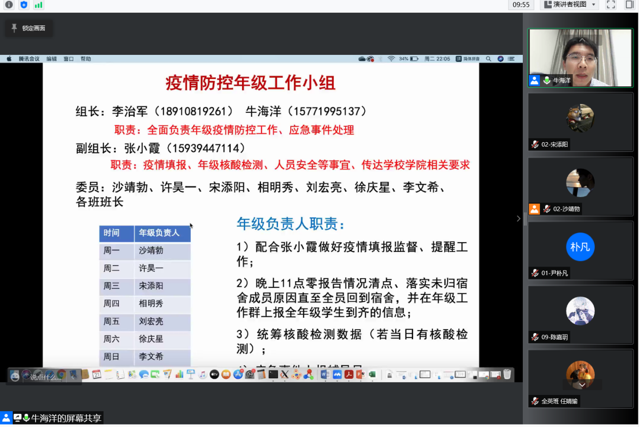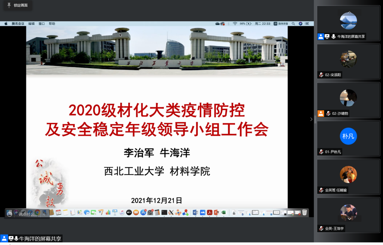 牛海洋对当前疫情情况进行了说明,并对年级如何落实好疫情防控有关要求进行了强调,要求各班同学严格遵守学校疫情防控有关要求,众志成城,共抗疫情。李治军重点介绍了学校寒假离校返校及近期安全管理有关要求,同时要求全体同学应树立起责任意识,履行防控义务,每日及时完成疫情填报和核酸检测并上报。