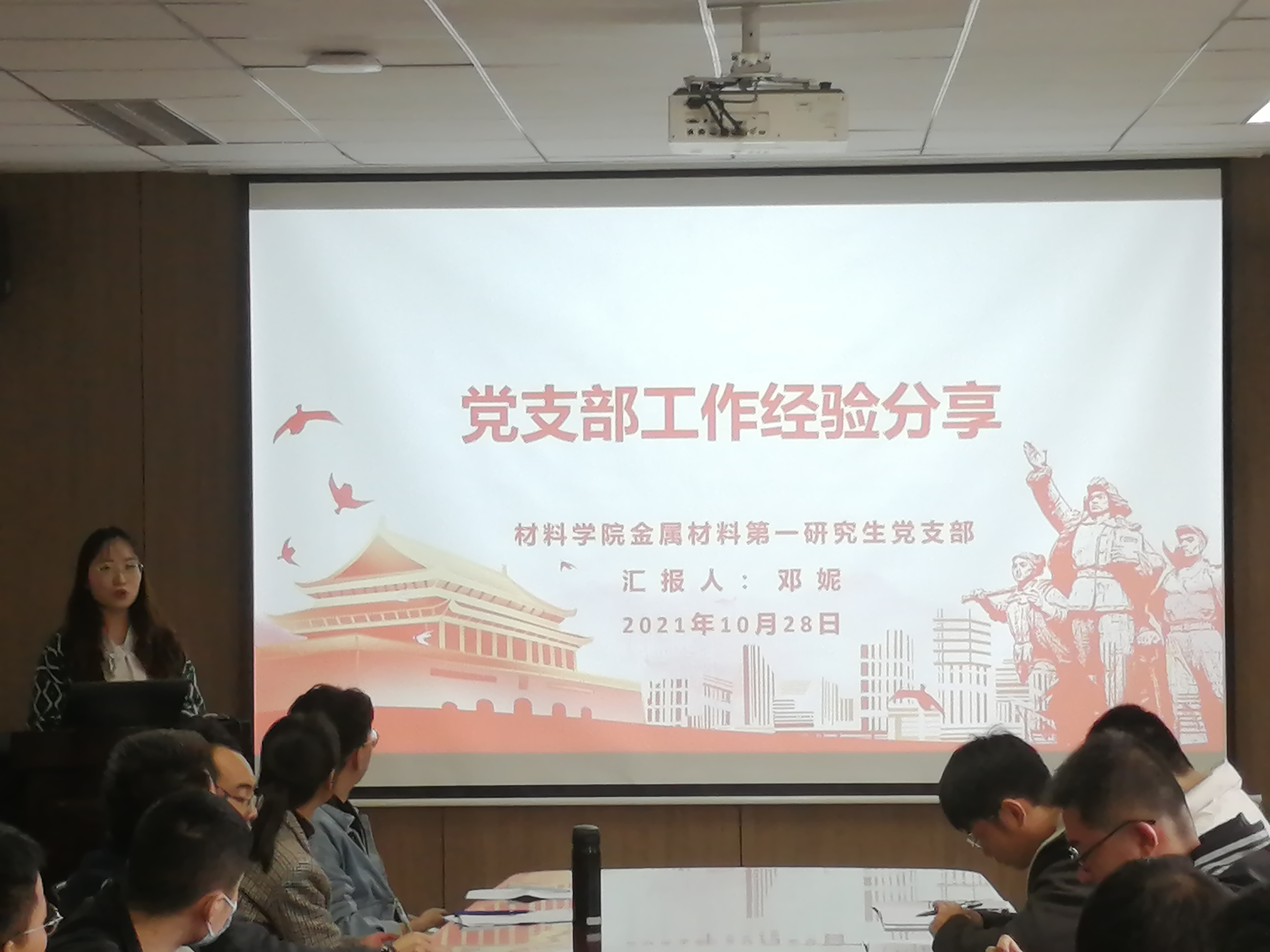 首先,由学生样板党支部——碳材料师生融合党支部和金属第一研究生党支部做工作经验分享。胡逗和邓妮同志围绕党员教育发展、弘扬“传、帮、带精神”、“外学内进,内促提升”等方面进行经验的分享,并深入浅出地分享了他们支部建设发展的经验,帮助大家对标对表找差距、聚焦不足谈整改。