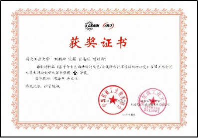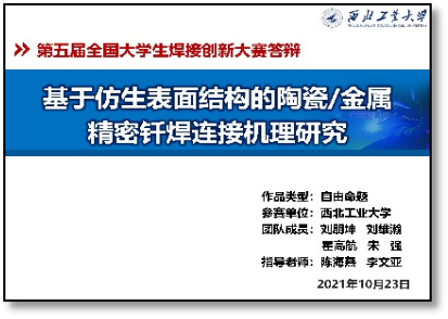 学生刘朋坤、霍高航、宋强、刘维瀚共同完成的作品《基于仿生表面结构的陶瓷/金属精密钎焊连接机理研究》荣获比赛一等奖,作品指导教师为陈海燕副教授和李文亚教授,李京龙教授、张勇副教授也为作品提供了细心指导和帮助。