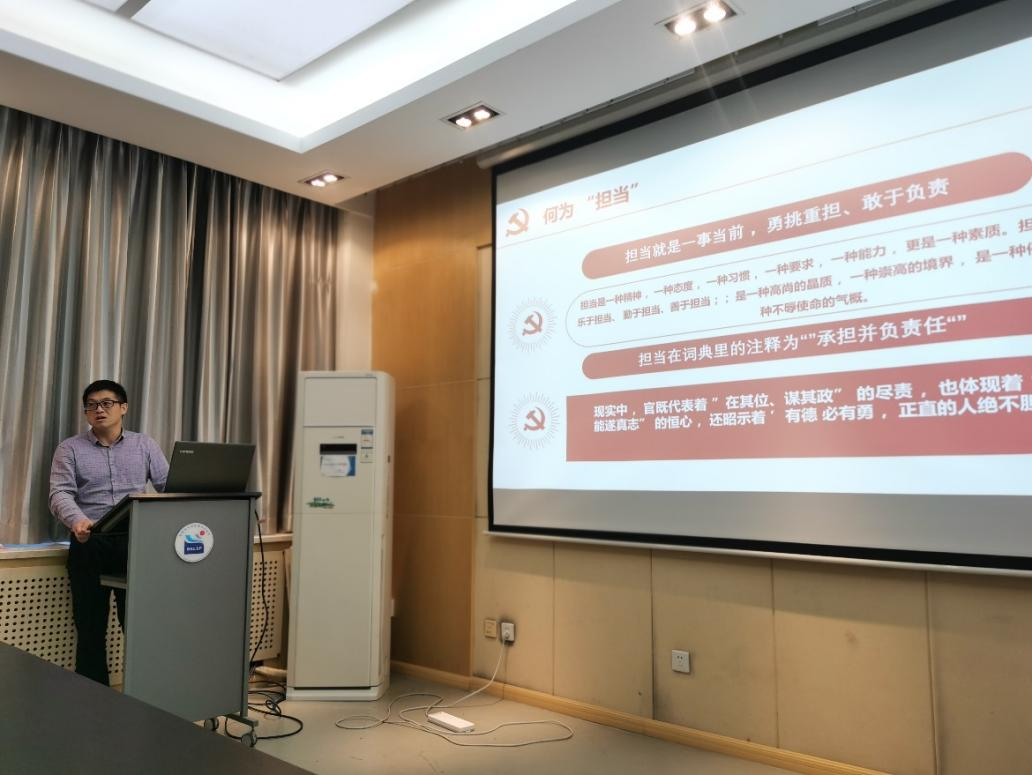 讲授过程中,史俊勤结合自己研究生阶段的学习经历,以生动形象的例子告诉同学们,作为新时代的青年党员,要时刻牢记初心和使命,要将共产党员的责任、担当与自己的研究生学习和科研紧密结合;专注于科研的同时,也要注重对社会的责任担当,优秀的科研成绩和美好的生活都离不开担当精神;指出同学们一定要继承和弘扬先辈们的担当精神,无论是在工作中还是生活中都要做到“敢于担当、能够担当、勇于担当”。
