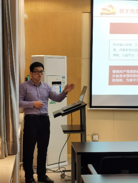 史俊勤以中国共产党的初心和使命——为中国人民谋幸福,为中华民族谋复兴,切入到中国共产党的担当精神。围绕“如何理解共产党员的担当”“勇于担当是全面从严治党的必然要求”“如何在实践中勇于负责敢于担当”三个主题为同学们做了深入浅出的讲解。