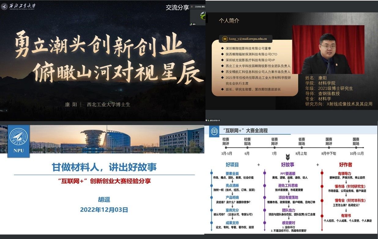 首先由康阳同学做了题为“勇立潮头创新创业,俯瞰山河对视星辰”的专题报告,系统介绍了自己的创新创业经验,分享了自己的心得体会。其次,胡逗同学围绕“甘做材料人,讲出好故事”主题进行分享,讲述了自己参加“互联网+”创新创业大赛的全流程,并重点介绍了参赛项目答辩PPT制作的要点。
