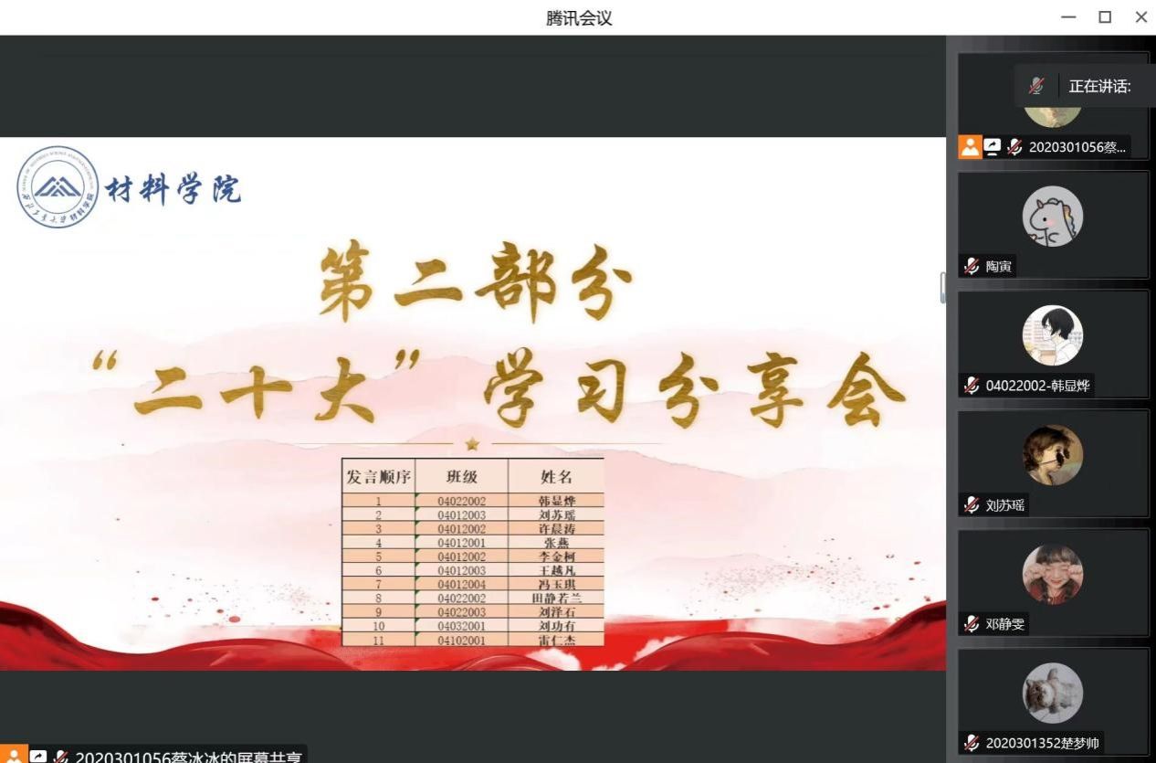 宣讲过后,韩显烨、刘苏瑶、田静若兰等11名同学分享了学习二十大精神心得,以及对新修订的党章的理解。在分享会阶段,同学们纷纷表示,作为西工大学子,应将党的二十大精神落到实处,努力学习,开拓进取,用知识武装自己,提高自身科研能力和实践能力;更应敢为人先,材料报国,成为不局限于纸面知识而是具有真正解决难题实力的人才,为国家的材料科学事业尽自己的一份力。