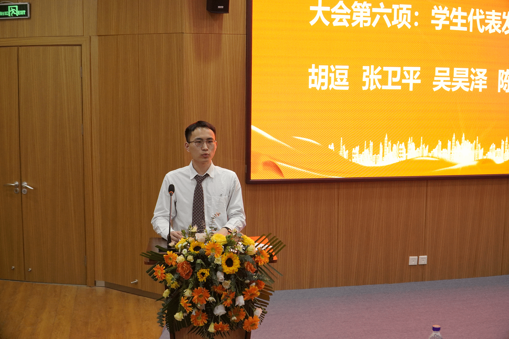 大会第五项,受表彰的学生代表胡逗、张卫平、吴昊泽、陈悦檀依次作了交流发言,分享与交流了他们的学习、科研经验。