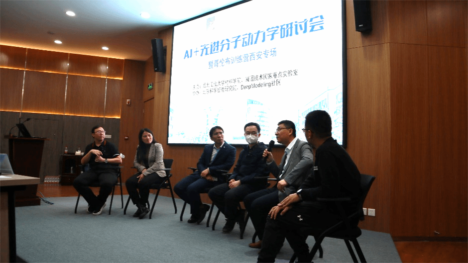 针对AI+先进分子动力学未来可能面临的机遇与挑战,在研讨会的最后,参会的六位老师展开了圆桌讨论,探讨自己的看法和见解。本次讨论主要就“AI for material science的挑战”、“DPA等大数据模型对AI for material science的冲击与机遇”、“AI+先进分子动力学方法未来的机遇”三个议题展开讨论。各位老师分别从软件开发者以及科研人员的角度给出了相关思考。