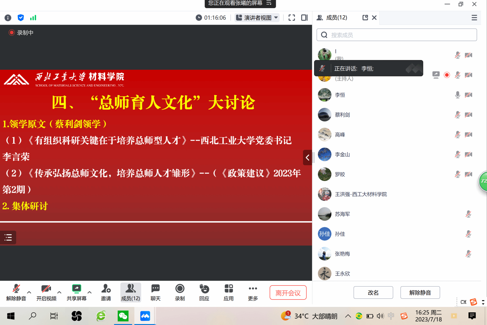 学院党委副书记蔡利剑传达了《关于在全校进一步深入开展“总师育人文化”讨论的通知》,组织与会人员结合学院实际情况,围绕“总师型”人才特质内涵、“总师型”人才大学培养路径和体系的完善、“总师型”人才培养的未来趋势和要求三个方面进行了深入的交流研讨。与会人员一致认为,要以此次“总师育人文化”研讨为契机,聚焦国家战略需求和材料强国目标,在系统梳理“总师型”人才培养规律的基础上,不断优化学院人才培养方案,大力培养拔尖创新人才,为培养更多“总师型”人才、续写新时代新征程人才培养“西工大现象”贡献力量。
