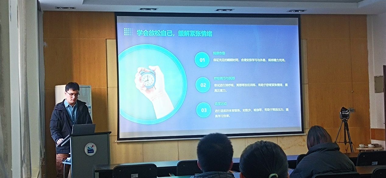 第二位曹哲芸同学更加侧重于大家的日常生活习惯饮食等方面对大家进行了分享,建议大家一定要保证充足的睡眠,这样才有精力去保持高效的学习状态,同时也要进行适当的体育锻炼,有助于释放压力和提高学习效率,在考前一定要准备好、检查好相关证件和资料,提前熟悉考场周围环境和交通路线。