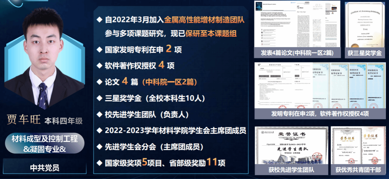 在大创项目方面。贾车旺更是展现出了卓越的创新和实践能力。在学期间他累计参与了2项国家级大创项目,在指导教师林鑫、李文亚教授等国家领军人才的专业指导下,将所学理论知识应用于实践中,不仅锻炼了他的科研思维和实验技能,更让他学会了在面临挑战时如何进行团队协作。在大创项目的实施过程中,贾车旺深刻体会到了“总师育人文化”中强调的实践与创新精神,这让他更加坚定了走科研这条路的决心。