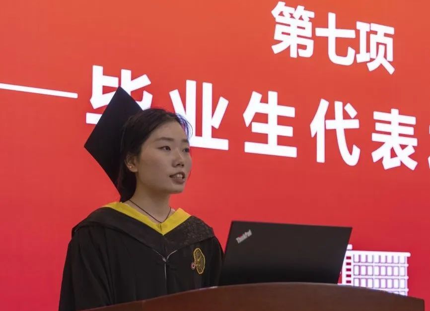 柳雨萌代表本科毕业生发言,她感恩母校提供的学习平台与实践机会,感谢老师们的悉心教导和同学们的温暖关怀。祝愿学院培育更多破解“卡脖子”难题的国之栋梁,让世界见证中国新材料的硬核光芒!